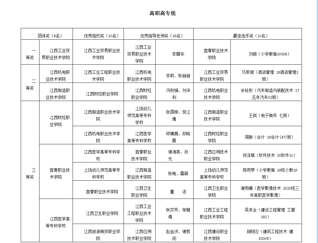 本次竞答赛各奖项是省委教育工委、省教育厅依据满分率、参赛率、平均分等因素综合评分,分别评选出本科、高职高专组团体奖各6名;依据参赛选手个人成绩高低和答题时间快慢等因素,评选出本科、高职高专组最佳选手奖各10名;依据各校组织学习情况,评选出本科、高职高专组优秀组织奖各10名;依据团体比赛成绩、各校组织学习等因素,评选出优秀指导老师奖36名。