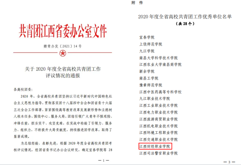 4月6日,团省委办公室印发《关于2020年度全省高校共青团工作评议的通报》,我校团委在团省委组织的2020年度全省高校共青团工作评议中获“优”格次,被评为全省高校共青团工作优秀单位。