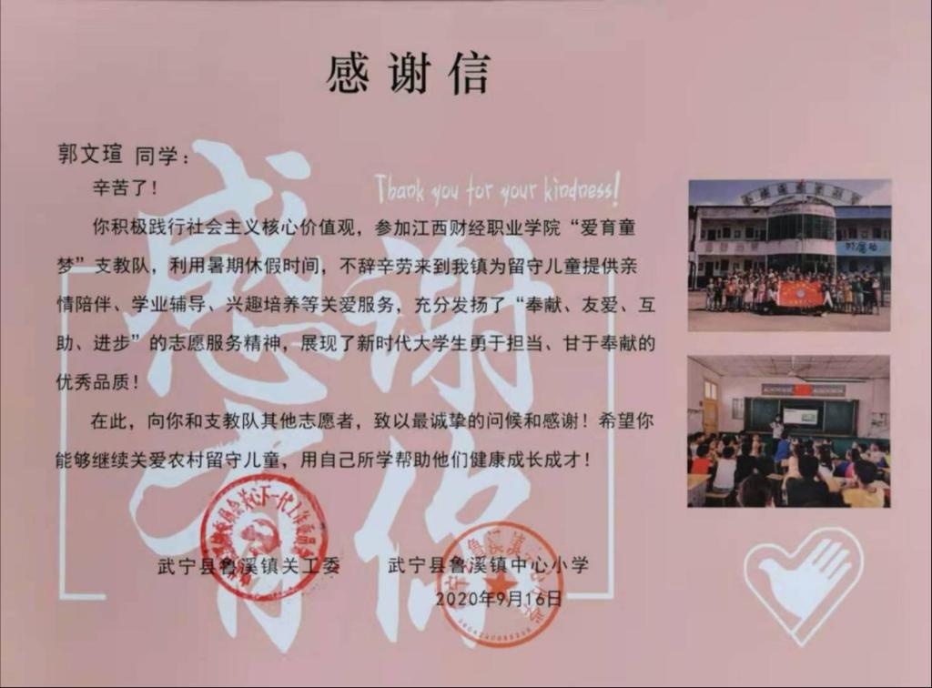 徐副书记对公益家教社两年来为鲁溪镇留守儿童开展的爱心活动表示感谢,对志愿者的奉献精神给予了高度评价,代表鲁溪镇关工委和中心小学向公益家教社赠送“关爱留守儿童,助力乡村振兴”锦旗一面,为关爱鲁溪留守儿童的每位志愿者颁发了精心制作的感谢信。