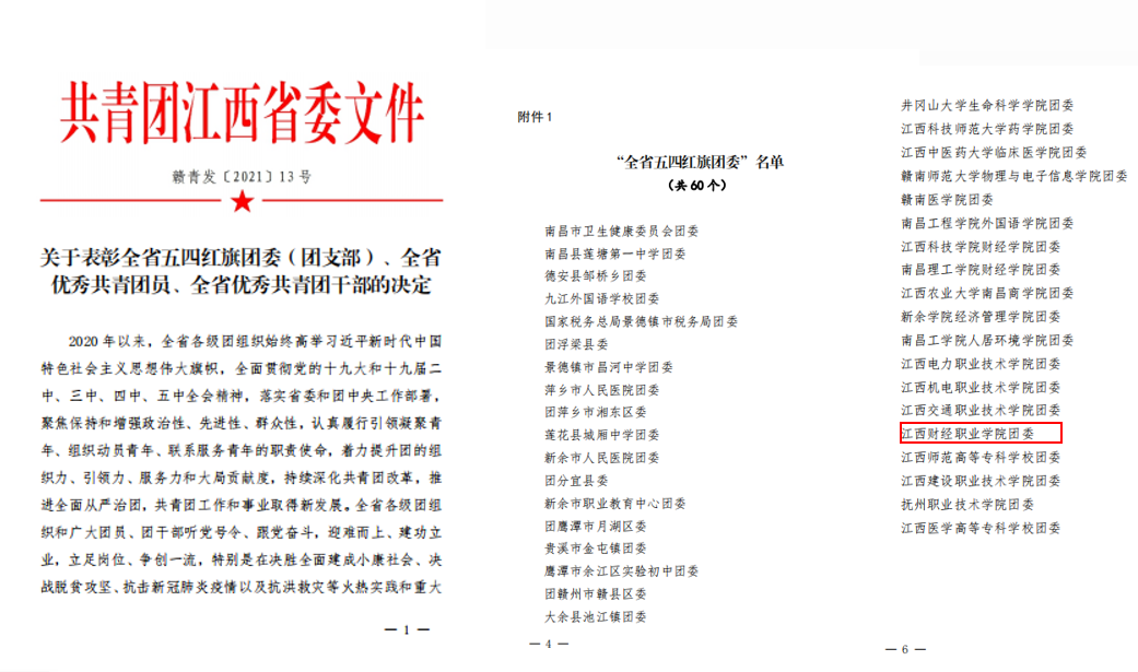 4月30日,共青团江西省委印发《关于表彰全省五四红旗团委(团支部)、全省优秀共青团员、全省优秀共青团干部的决定》(赣青发〔2021〕13号),继校团委被评为2020年度全省高校共青团工作优秀单位后,我校共青团工作再传喜讯,获评2020年度“全省五四红旗团委”。
