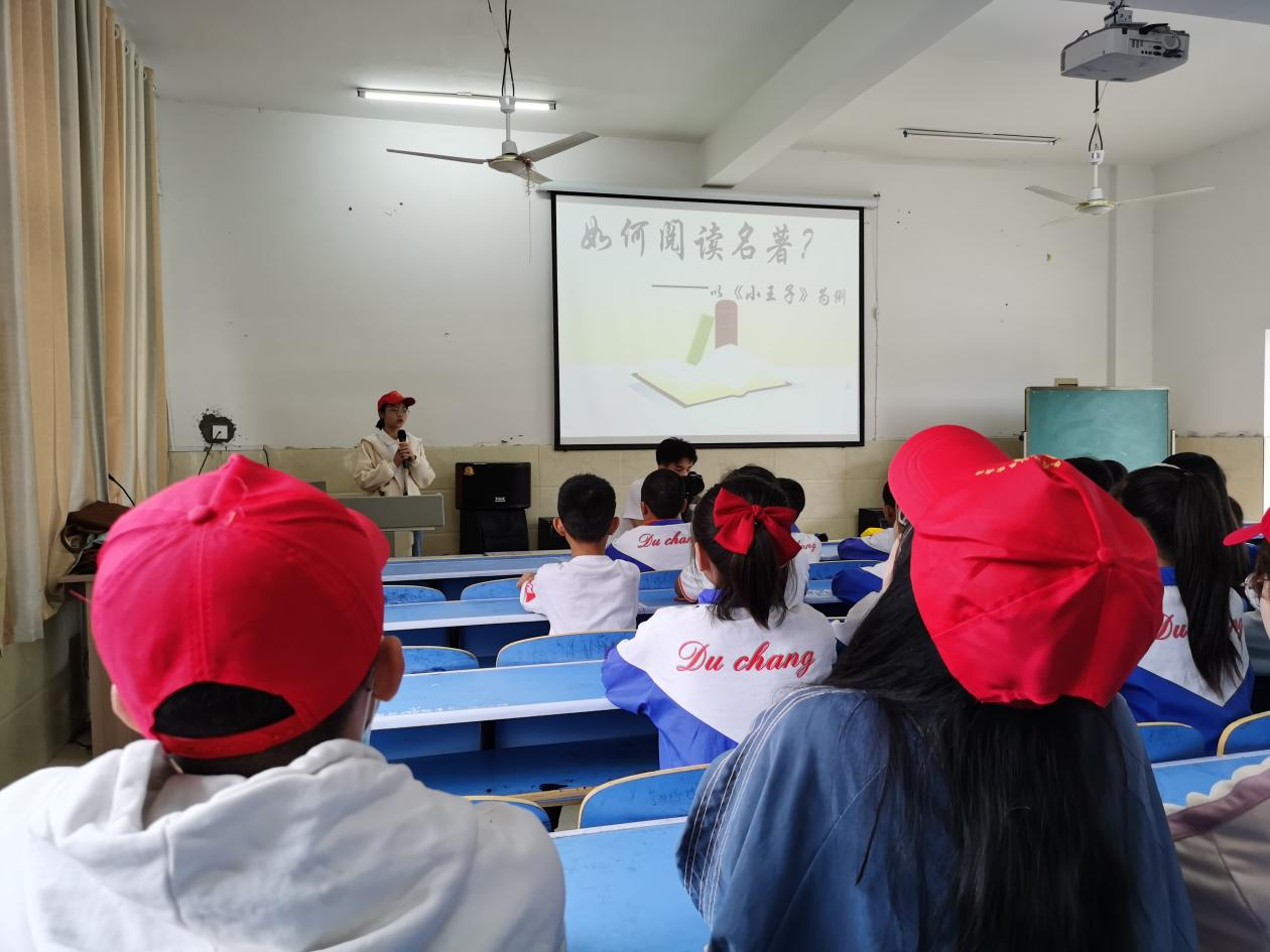志愿者彭龙英以《如何阅读名著》为主题给孩子们讲了一堂阅读指导课,并以《小王子》中的一些精彩片段为例,与孩子们分享了“三遍”阅读法:读第一遍,要学会按照时间、地点、人物、事件等关键词复述故事;读第二遍,用“圈、点、线”进行批注;读第三遍,把自己的阅读收获记录下来。课堂上,计老师不时地与孩子们互动,孩子们参与的积极性很高,气氛非常活跃。