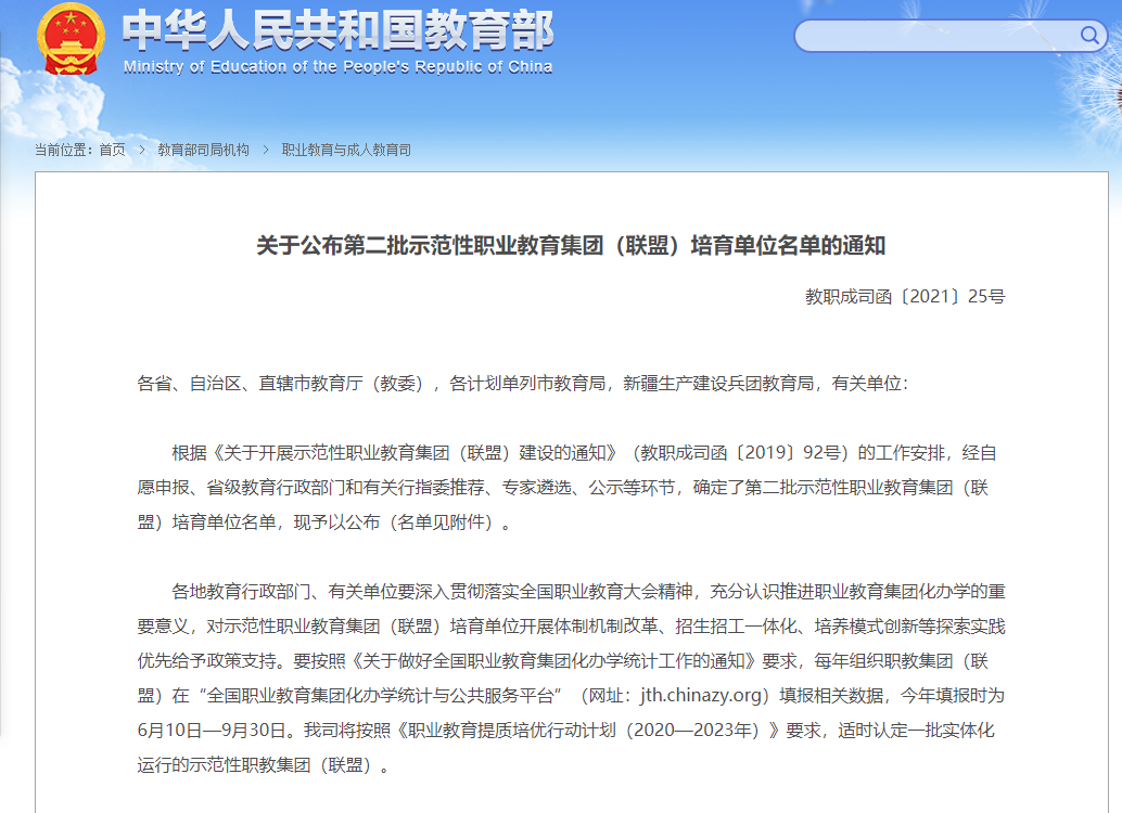 近日,教育部公布了全国第二批示范性职业教育集团(联盟)培育单位名单(具体见《关于公布第二批示范性职业教育集团(联盟)培育单位名单的通知》教职成司函2021【25号】文件),江西财经职教集团成功入选。