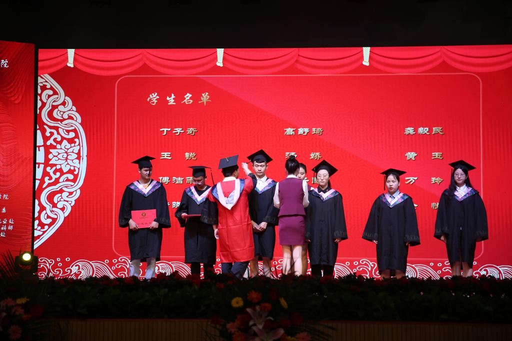随后李春根教授、刘彪文教授,分别为本科部毕业生代表进行了颁发毕业证及授予学位仪式。帽上的流苏拨过,曾经的青春岁月、温暖的美好祝福、收获的幸福成果都定格在一张张照片中。
