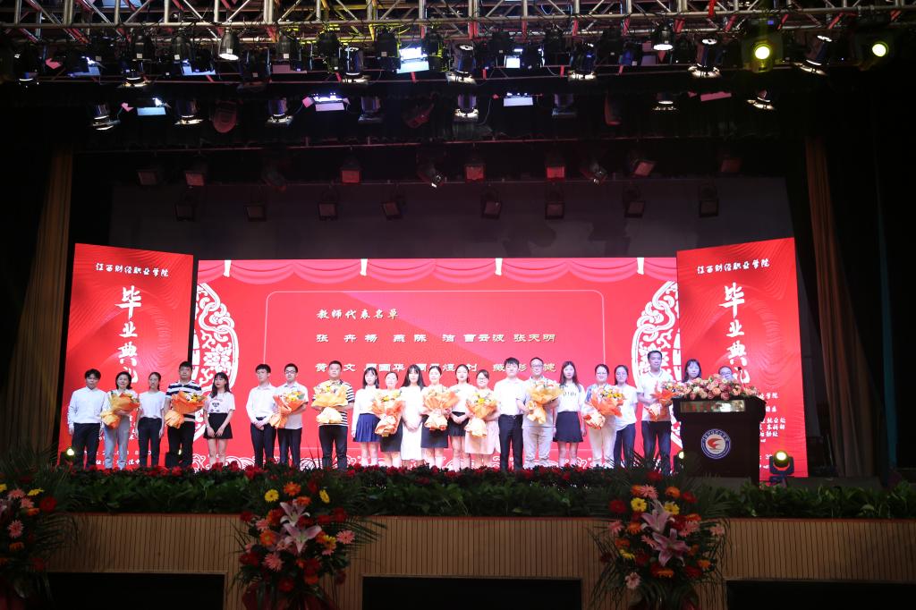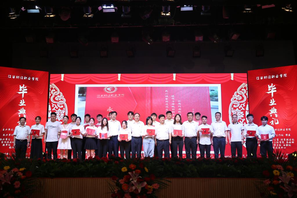 廖国琼和校党委委员邱家明分别宣读江西财经大学《关于表彰2021届本科毕业生先进个人的决定》与江西财经职业学院《关于表彰2021届第一批优秀毕业生的决定》,周冬华和校党委副书记、常务副校长何先应,党委委员、纪委书记阙沪平分别为本科与专科毕业生代表颁发优秀毕业生荣誉证书。
