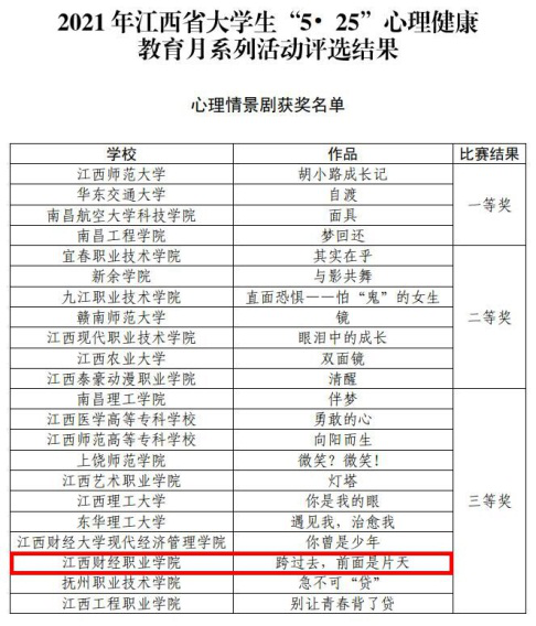 2021年9月1日,省教育厅《关于公布 2021 年江西省大学生 “5? 25”心理健康教育月系列活动评选结果的通知》正式公布了获奖结果。我校选送的两项作品喜获三等奖。一项为心理情景剧《跨过去,前面是片天》,喜获“剧暖心·更青春”校园心理情景剧大赛三等奖(参演学生:洪思睿、方露、孙良豪、靳雨欣、王玉彤、张展豪、余秋梅、熊佳欢;指导教师:王美娟、张亦弛);一项为心理微电影《一念之间》,获评“多彩青春·与心同行”心理微电影大赛三等奖(参演师生:万凯、王美娟、张亦弛、周婷、徐昌达、门子俊楠、祝献东;指导教师:王美娟、张亦弛)。