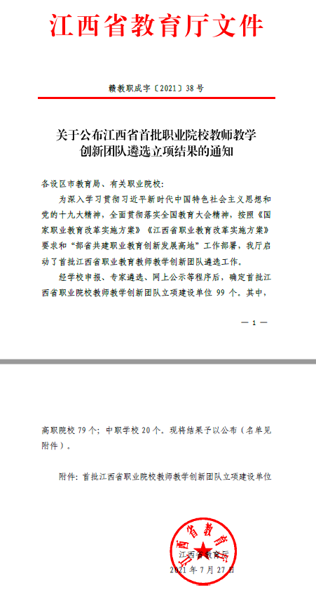 暑期,江西省教育厅发布《关于公布江西省首批职业院校教师教学创新团队遴选立项结果的通知》,我校智能建造技术等6个专业教师教学创新团队成功入选。具体如下。