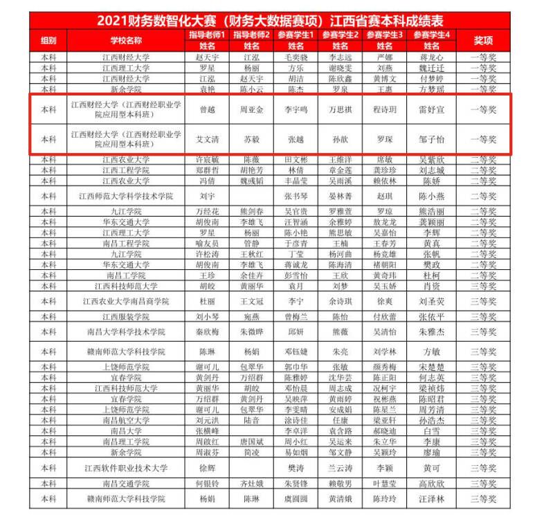 近日,随着线上答辩环节圆满结束,第二届财务数智化大赛(财务大数据赛项)江西省赛圆满落下了帷幕,我校2019级会计学职教本科班派出张越、邹子怡、罗琛、孙歆、李宇鸣、万思祺、雷妤宣、程诗玥共8名同学组成两支代表队参加本次竞赛,同学们奋勇争先,以饱满的竞技状态迎接了挑战,从全省48本科参赛队伍中突出重围,最终两队均取得了省赛一等奖的优异成绩!