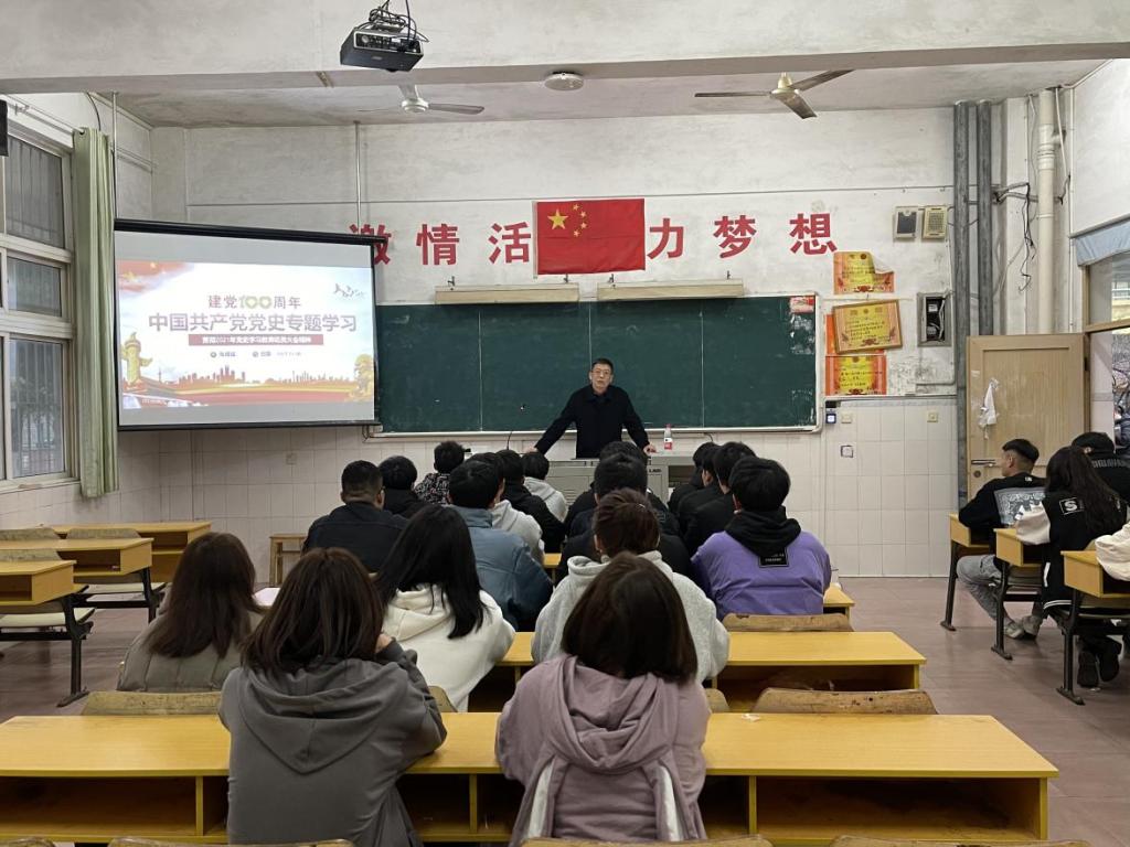 在教学楼104教室,张成斌教授召开了以“学习百年党史,凝聚奋进力量”为主题的班会?;嵘希懦杀蟠腔毓肆酥泄膊车陌倌攴芏肥?,从“开天辟地”的新民主主义革命时期讲述到“改天换地”的社会主义革命时期,从“翻天覆地”的改革开放时期谈论到当今“惊天动地”的中国特色社会主义新时代。班会的最后,张成斌指出青年大学生是整个社会力量中最积极、最有生气的力量,国家的希望在青年,民族的未来也同样在青年,希望同学们保持信念、怀揣梦想,为祖国日后的繁荣昌盛做出贡献。
