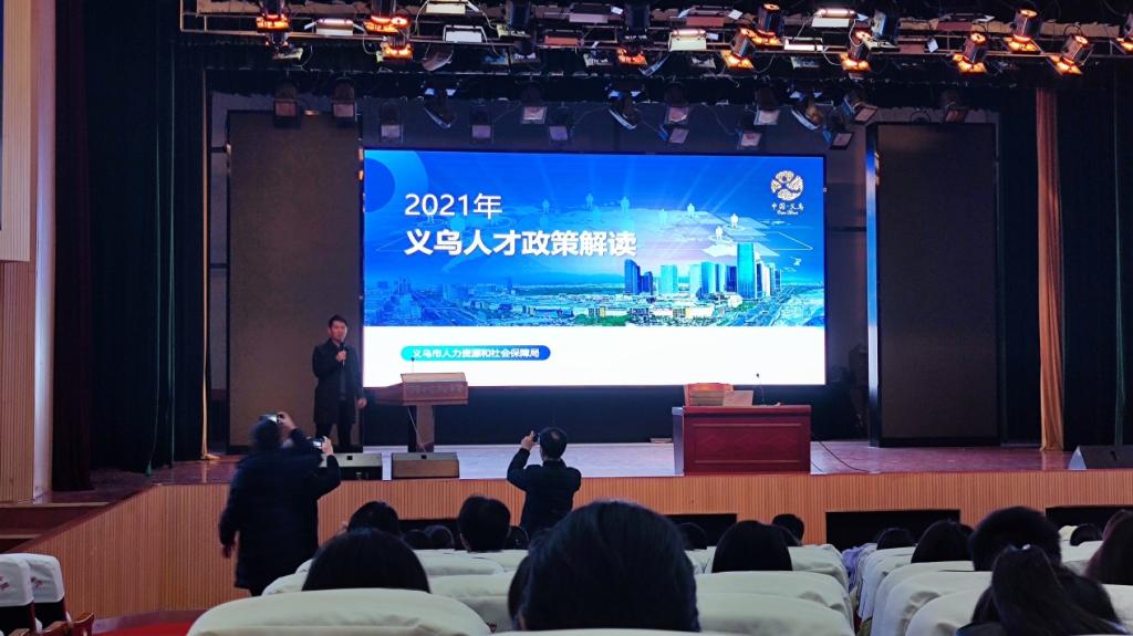 为全力促进我校毕业生尽早就业,进一步做好政策指引和就业服务,11月23日下午,我校联合义乌市人力资源和社会保障局在学校英才交流中心共同举办义乌市人才政策宣讲会。义乌市人才管理服务中心主任吴群伟、副主任骆旭伟、科长鲍腾飞,义乌市迎乐软件科技有限公司人事经理王翔,义乌万派电子商务有限公司人事经理涂爱章,学校外国语学院、经济贸易学院、招生就业处负责人和500多名2022届毕业生参加本次活动。
