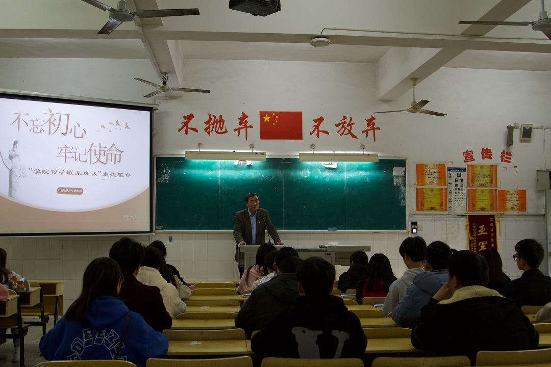 为扎实推进党史学习教育,深入学习宣传党的十九届六中全会精神,贯彻落实校领导联系班级制度,2021年11月26日下午,校党委委员、纪委书记阙沪平围绕“学史明德不忘初心、牢记使命开创未来”的主题,在教学楼208室为财税金融(建筑工程)学院2021级金融服务与管理2班学生上思政课,并以班主任身份召开了“远离非法校园贷”主题班会。
