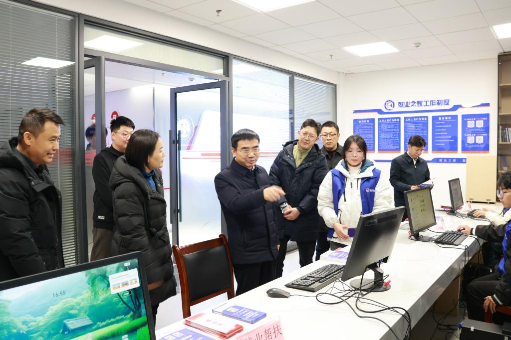 蒋文定一行来到我校5+2就业之家,实地查看一站式就业服务大厅、就业直播间、大数据分析室等,认真听取相关情况汇报,详细了解学校人才培养、就业指导、创业服务等情况,饶有兴致地体验“智慧求职机”认证授权、岗位查询等功能,并与正在备战大学生职业规划大赛的师生亲切互动。