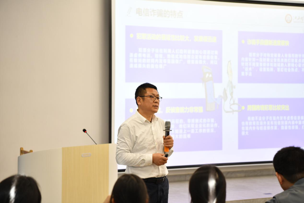 3月25日下午,校党委委员刘锋在洙泗学馆117教室为财税金融学院师生作题为《电信网络新型违法犯罪防范知识宣传》的专题讲座。讲座以“不参与、不相信、不理睬、不汇款”为核心,结合真实案例,深入剖析电信诈骗的常见手段及防范措施,旨在提升师生反诈意识,筑牢校园安全防线。