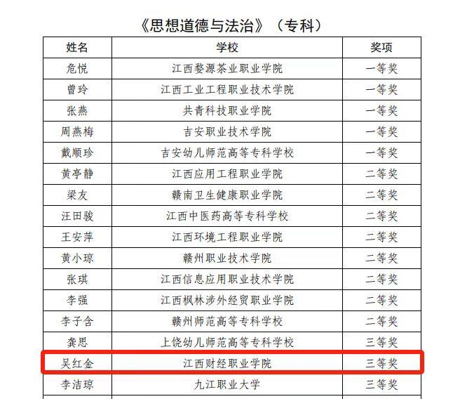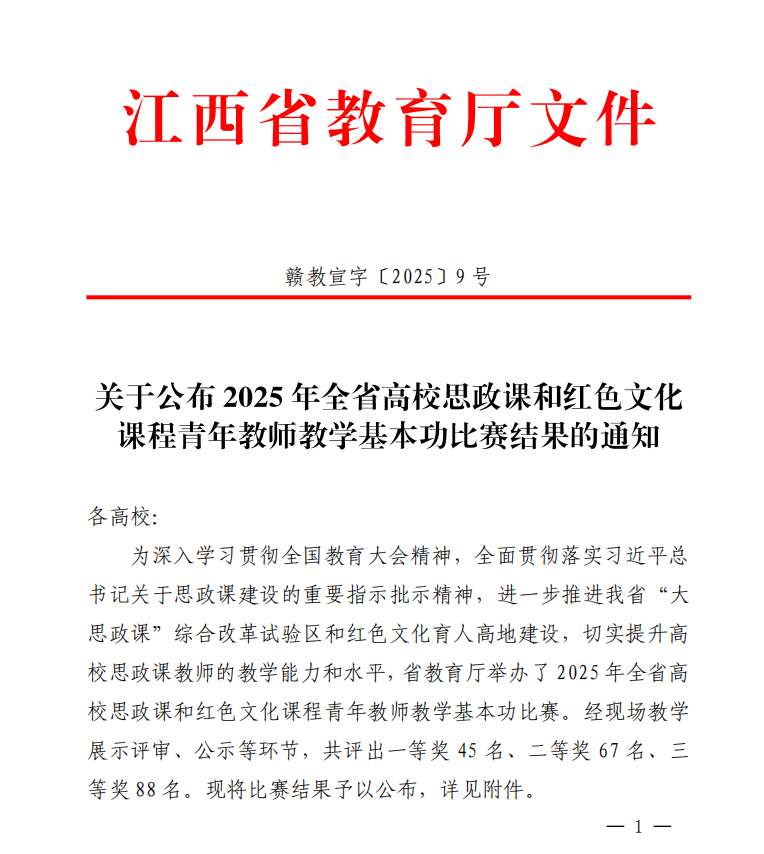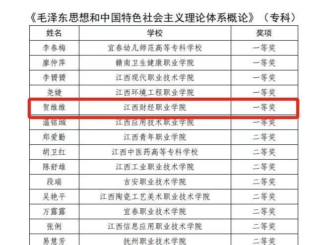 近日,由中共江西省委教育工委、江西省教育厅举办的2025年度全省高校思政课和红色文化课程教学比赛结果公布。经过激烈角逐,我校两位思政课教师在比赛中荣获佳绩,其中,贺维维荣获“毛泽东思想和中国特色社会主义理论体系概论”课专科组一等奖,吴红金获“思想道德与法治”课专科组三等奖。