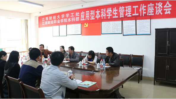 座谈会上,本科部总支书记向来宾介绍了我校领导对职教本科班的高度重视,同时介绍了学生管理工作的基本情况,包括本科部精良的师资、班主任配置和优良的住宿条件,以及本科班同学们较强的学习能力和出色的综合素质。并谈到本科部的全体师生正按照我校党委书记何桑教授提出的将职教本科合作实验班办成“精品课程班、超强动手班、学习标杆班、师德模范班、管理样板班”的总体要求,坚持立德树人,突出内涵建设,夯实工作基础,完善管理制度,注重工作创新,提升育人质量,全面做好职教本科班的工作。随后,江西财经大学学工处的领导和老师们详细介绍了财大学工处的发展近况及具体服务学生的几个主要职能部门,方便我校师生前往财大对接工作。