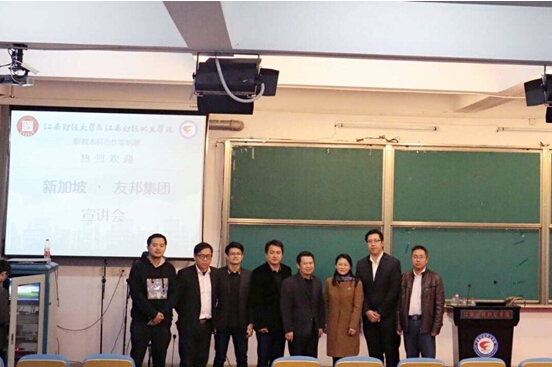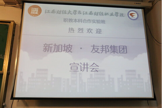 2015年11月8日下午,江西财经大学会计学院团委书记娄玮携新加坡友邦集团高管曾宪祥等三人来我校为职教本科班和校学生会大骨班的学生们做境外实习专题宣讲。新加坡友邦集团是江西财经大学会计学院的两个境外实习基地之一。由江西财经大学会计学院团委书记娄玮及新加坡友邦集团高管作主题宣讲。