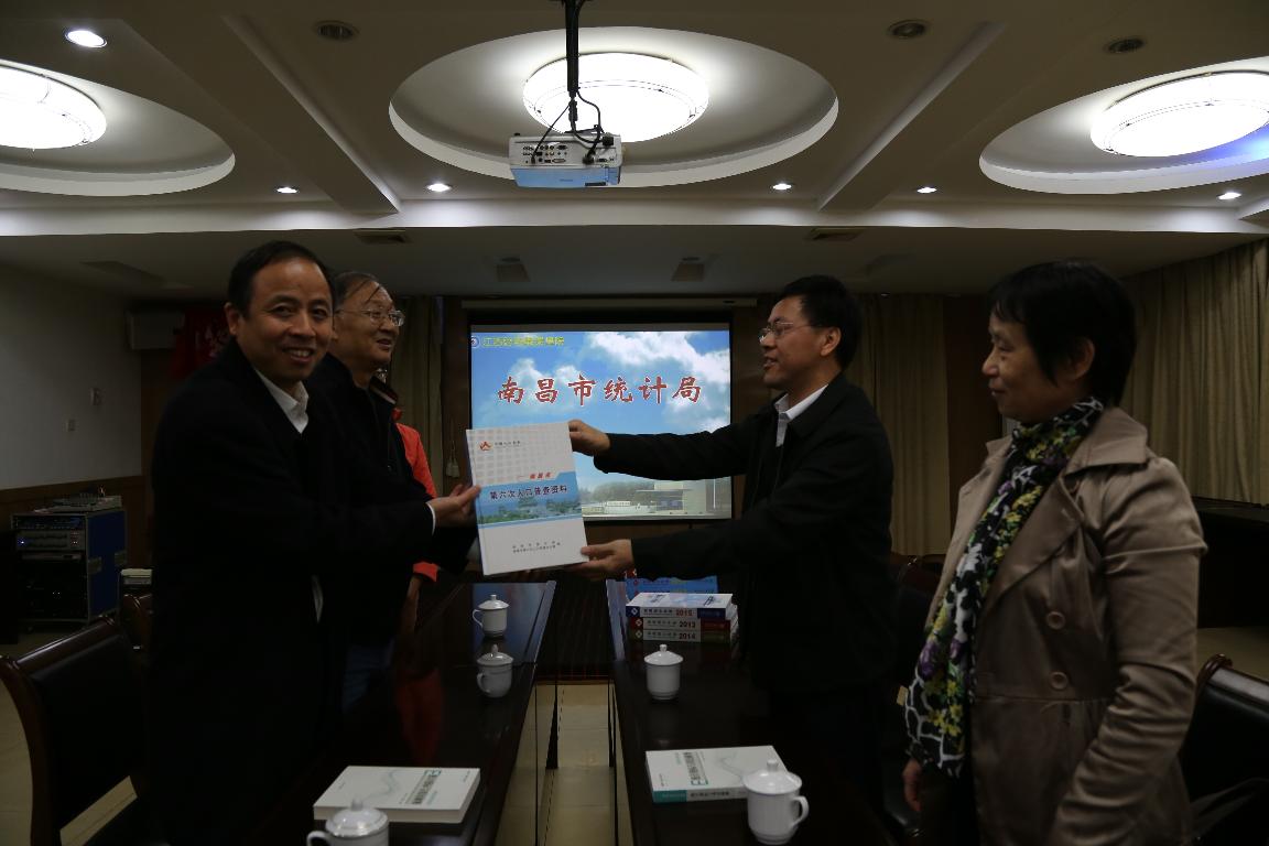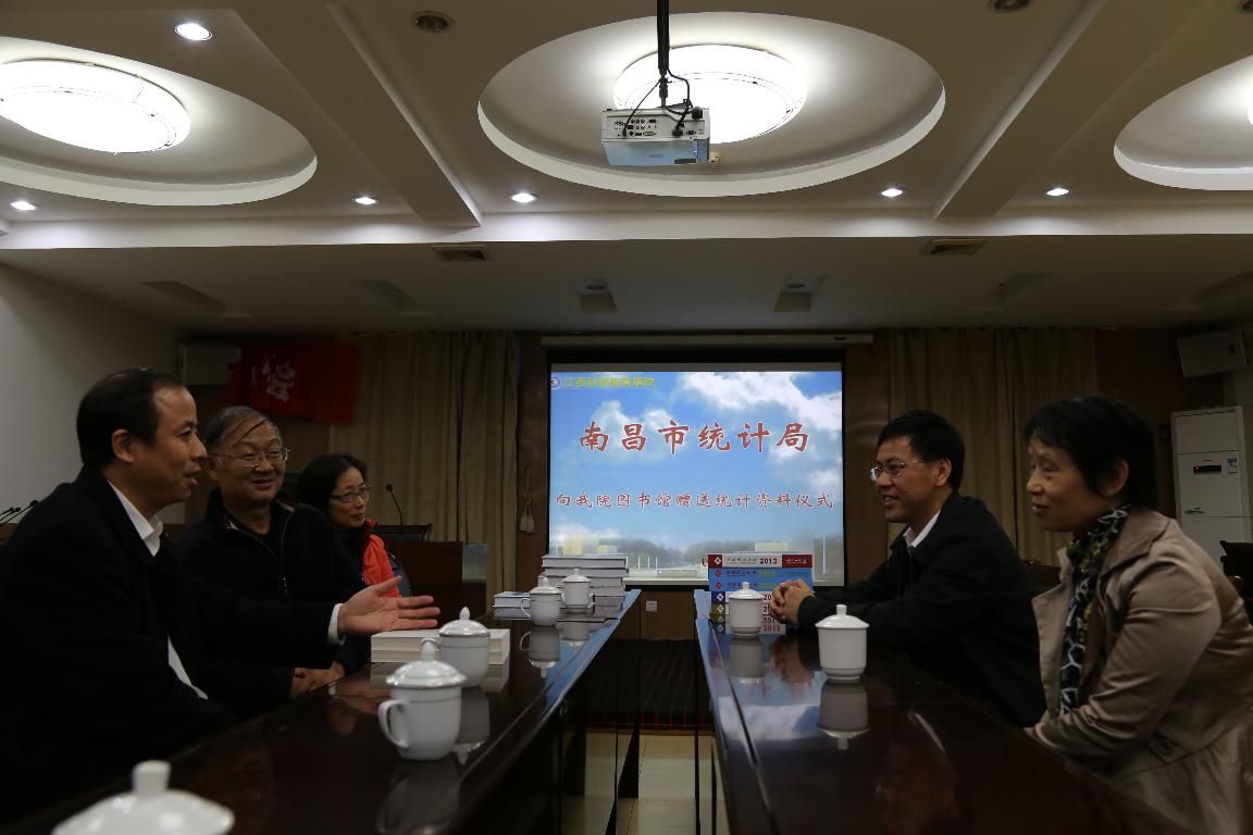 2015年11月11日下午,我校优秀校友南昌市统计局党组书记、局长万昱原协同省统计局国民经济核算处处长张家玉一行向我校图书馆赠送由其主编的2012至2015年《南昌统计年鉴》、《南昌市第六次人口普查资料》、《统计指标与用语解释》等图书。校党委副书记、校长林火平,校党委委员、副校长谢小云,校办公室主任邱家明,图书馆馆长熊水金,图书馆副馆长丛培华热情接待了万昱原校友一行。