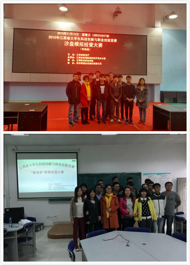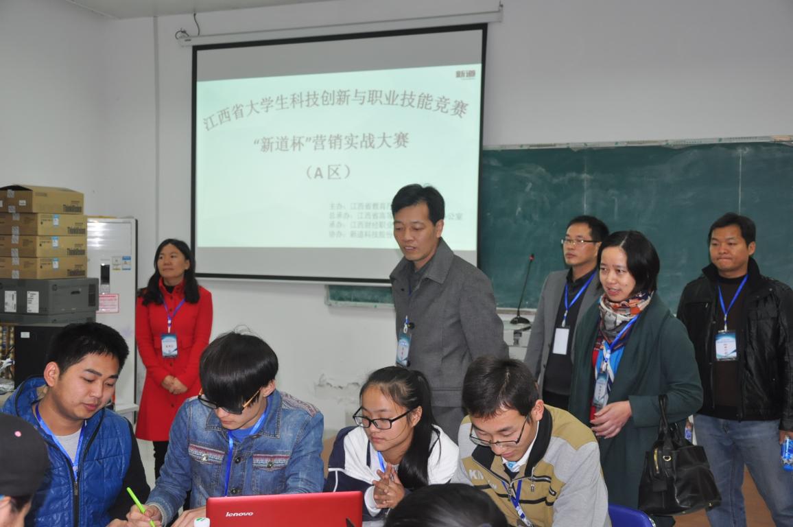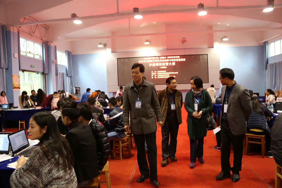2015年11月14至15日,江西省大学生科技创新与职业技能竞赛(专科组)——沙盘模拟经营和市场营销实战大赛在我校成功举行。两项赛事均由江西省教育厅主办,江西省高等院??萍伎旃易艹邪旌臀倚>咛宄邪?,用友新道科技有限公司担任协办。竞赛期间,我校常务副校长何先应教授、用友公司江西区总经理丁立波、教务处处长程文忠教授等一行巡视指导了两项比赛,工商管理学院负责人陪同。