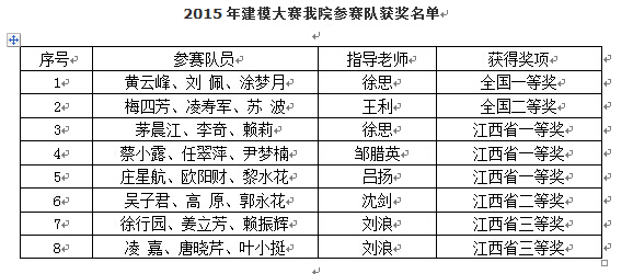 近日,2015年全国大学生数学建模竞赛成绩揭晓,我校参赛队喜获评奖比例仅为1.5%、5%的全国一等奖1项、二等奖1项,同时还荣获江西省一等奖3项、二等奖1项、三等奖2项,这是自2005年我校参赛以来获得的最好成绩,也是我校自2007年以来连续九年蝉联全国级奖项。在今年的该项大赛中,我校十支参赛队中有八支参赛队获奖,无论是获奖成绩还是获奖比例,我校都在江西省高职院校中名列前茅。