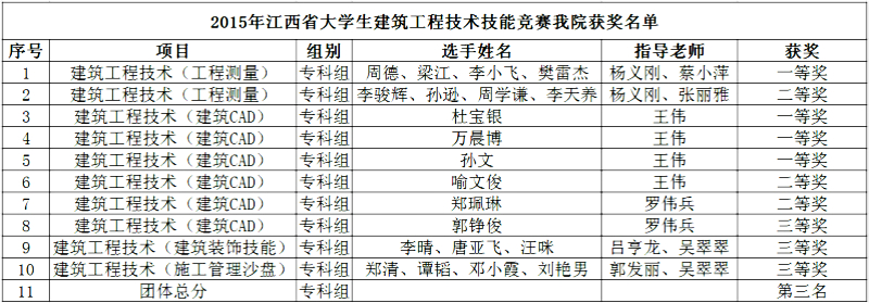 2015年江西省大学生建筑工程技术技能竞赛成绩于近日揭晓,我校代表队在工程测量、工程算量、建筑CAD、建筑装饰综合技能、施工管理沙盘等5个参赛项目中沉着冷静、勇于拼搏,共取得了4个一等奖、3个二等奖、3个三等奖、专科组(28所参赛院校)团体总分第三名的好成绩。
