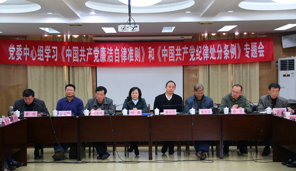 12月1日上午,学校在培训中心二楼会议室召开党委中心组学习(扩大)会,专题学习新修订的《中国共产党廉洁自律准则》和《中国共产党纪律处分条例》,并进行交流研讨。校党委书记何桑主持会议并就贯彻落实《准则》和《条例》提出明确要求,党委副书记、纪委书记曹锐作重点辅导发言,其他校领导都作了交流发言。全体中层以上干部参加学习。