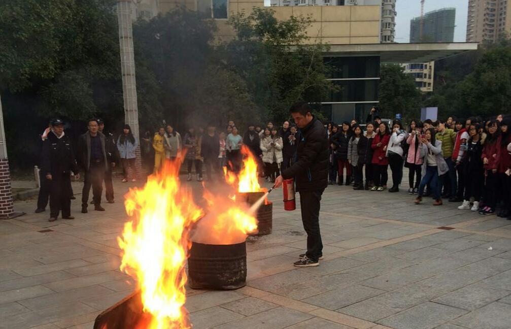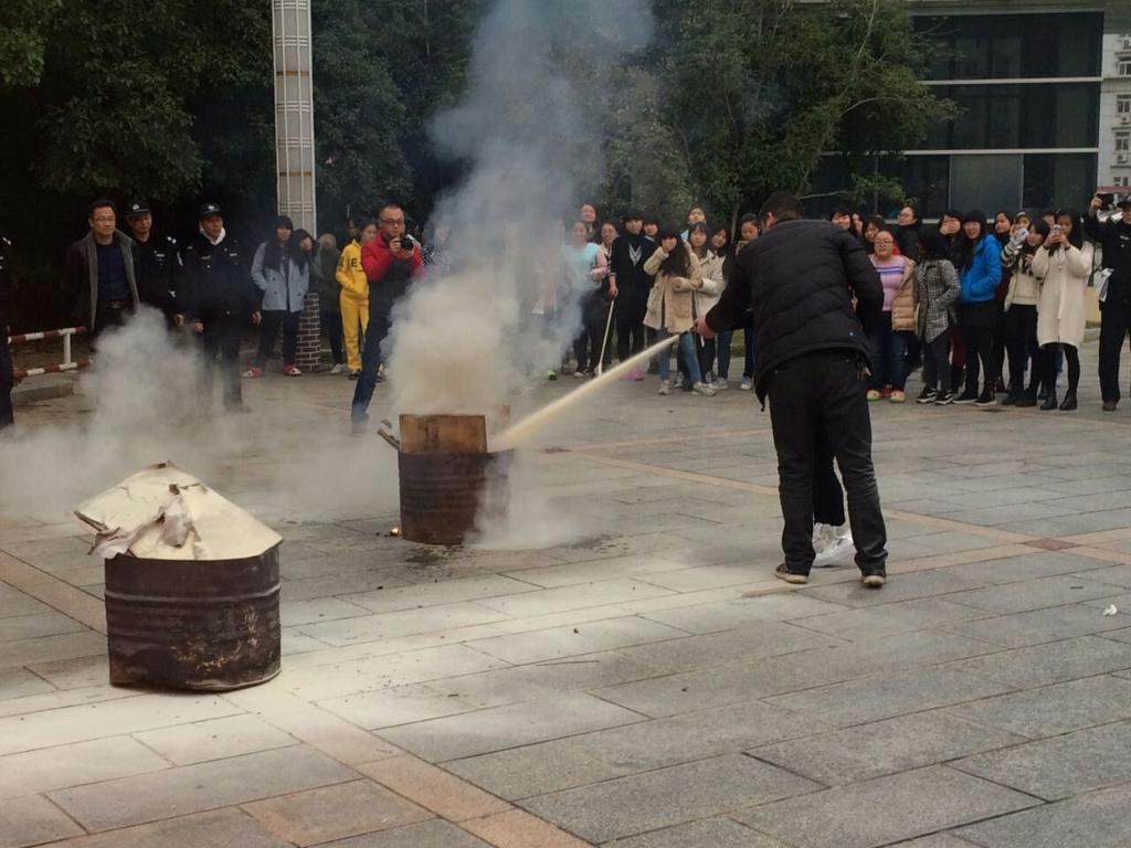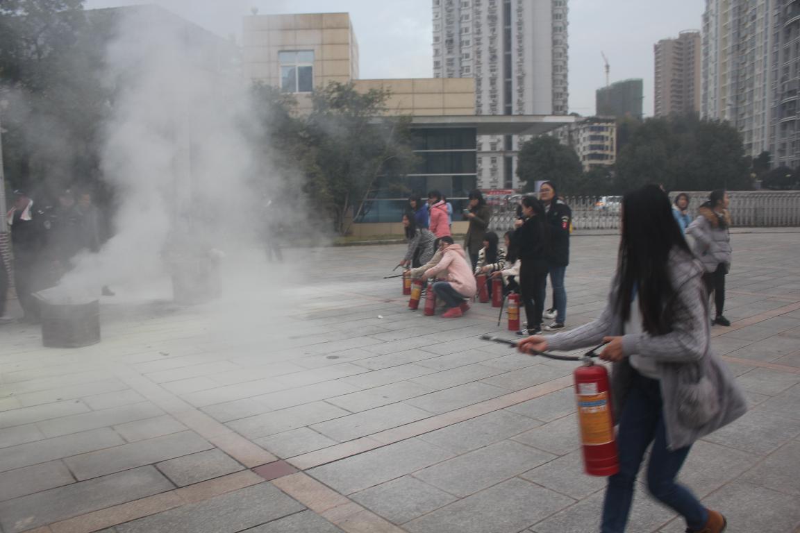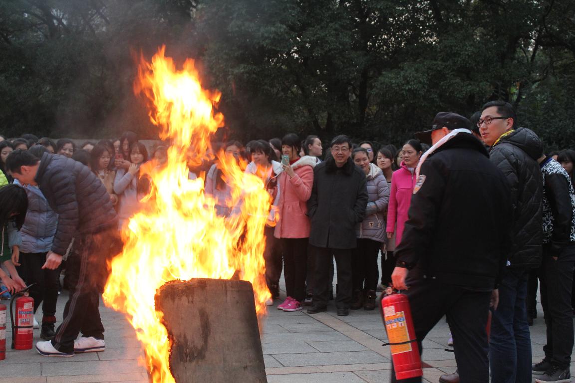 疏散完毕后在学院东大门又进行了灭火器现场灭火演练。