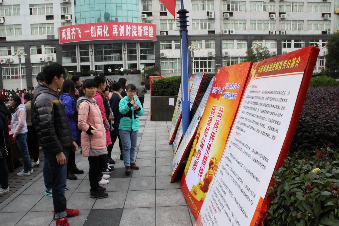 活动期间,在校园悬挂了“尊崇宪法,学习宪法,遵守宪法,维护宪法”、“弘扬社会主义法治观念,树立社会法治信仰”等宣传标语,学生各班召开了“尊法学法守法用法”主题班会,并制作法治宣传板报。12月4日下午,在学校文化广场举行了“国家宪法日暨全国法治宣传日”主题活动,介绍宪法和法律知识,发放学生权益保护和《中华人民共和国劳动合同法》知识传单,并开展弘扬宪法精神签名承诺活动。12月8日下午,学校组织全体教职工在七楼学术报告厅观看法治宣传视频《宪法的精神,法治的力量——CCTV2015年法治人物颁奖典礼》。12月7-13日,学校组织全体中层以上干部进行网上法律知识考试。