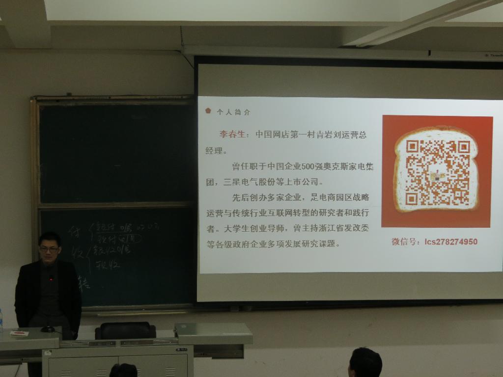 12月5日下午,由招就处、团委主办的大学生电商创业专题讲座在综合楼阶梯教室(六)如期举行。本次讲座由中国网店第一村浙江义乌青岩刘运营总经理、浙江理工大学创业导师李春生担任主讲老师。招生就业处处长周剑、团委副书记李智、KAB俱乐部成员、SYB培训班学员、大骨班学员及部分应届毕业生到场聆听。