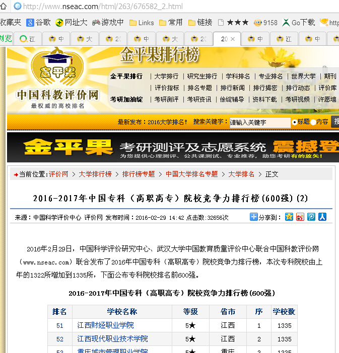 2016年2月29日,中国科学评价研究中心、武汉大学中国教育质量评价中心联合中国科教评价网(www.nseac.com)联合发布了2016年中国专科(高职高专)院校竞争力排行榜。我校竞争力为5星级(最高等级),在全国1335所高职高专院校中排第51名、江西省第1名。
