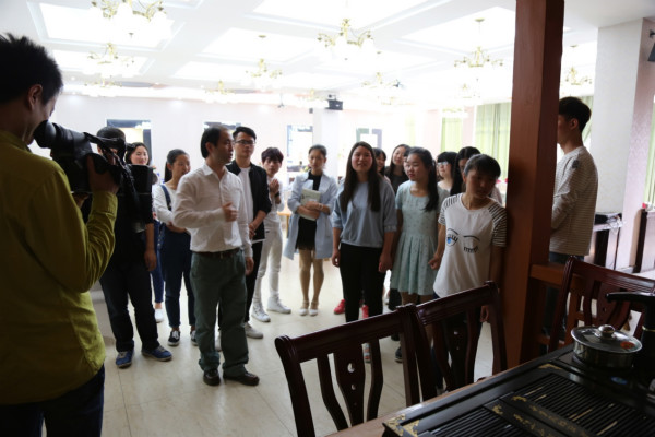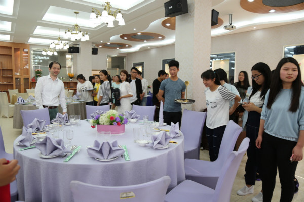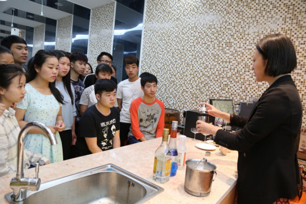在旅游管理实训中心,讲解老师向学生介绍了旅游实景沙盘并带领大家参观了中西餐实训室和茶艺实训室。在中餐实训室,向学生介绍了中西餐的基本操作技能以及区别,用餐礼仪和餐饮文化。在茶艺实训室,简要介绍了茶具的使用和茶叶的识别与泡制等。在调酒实训室,调酒师向观摩学生介绍了各式酒具的功能及用途、表演了各式鸡尾酒的调制方法,学生饶有兴致的进行了现场学习。