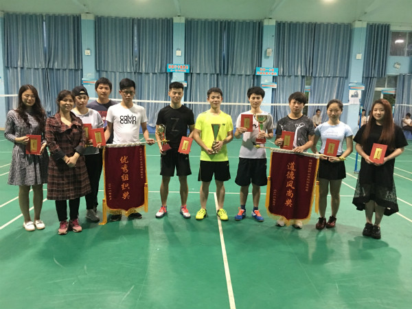 本次比赛包含了男单、女单、男双、女双和混双,每局21分,采用五局三胜制。经过精彩的角逐,经济贸易学院、本科部和会计第一学院的三支队伍脱颖而出,分别夺得冠军、亚军和季军?;峒频诙г汉托畔⒐こ萄г悍直鹑倩竦赖路缟薪焙陀判阕橹薄1究撇康谋笸?、经济贸易学院的聂彤昕同学、会计第一学院的姜瑞华同学、会计第二学院的郑璐佳同学、信息工程学院的邓豪同学、工商管理学院的何玲茹同学、财税金融学院的陈文霞同学和外国语学院的马新雪同学获得优秀运动员称号。比赛结束后,基础部郭红主任为获奖团队和优秀运动员颁奖并合影留念。