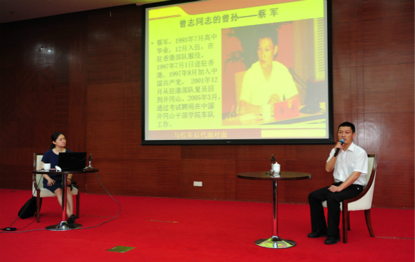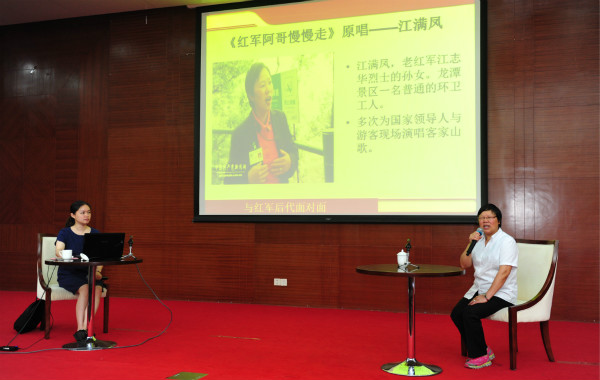 7月7日上午,培训班邀请王佐、曾志等老红军后代亲临现场互动、进行访谈教学,王华生、江满凤、蔡军三位老红军后代分别为我们现场讲述了先辈们和自己的故事,给我们上了一堂生动的革命教育课。王华生为我们讲述了他的曾祖父王佐当年支持革命事业、投身革命的英雄事迹。江满凤为我们深情演唱了由其祖父、老红军江志华原创的《红军阿哥你慢慢走》,并以朴实无华的语言讲述了自己艰辛创业、支助贫困学生的人生历程。蔡军以商品粮和七十四个信封的故事展现了曾祖母曾志“开怀天下事,不言身与家”的高风亮节,尤其是那篇读之令人落泪的《生命熄灭的交代》,深深触动了每一位在场人员的心灵,让大家深切地受到了革命精神的洗礼。