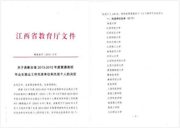 近日,从江西省教育厅《关于2013-2015年度全省普通高校毕业生就业工作评估结果的通报》(赣教就字[2016]5号)、《关于表彰全省2013-2015年度普通高校毕业生就业工作先进单位和先进个人的决定》(赣教就字[2016]6号)中获悉,我校在江西省2013-2015年度普通高校毕业生就业工作评估中被评为“优秀等级学?!?,并荣获“就业工作先进单位”称号,这也标志着我校连续12年获此殊荣。