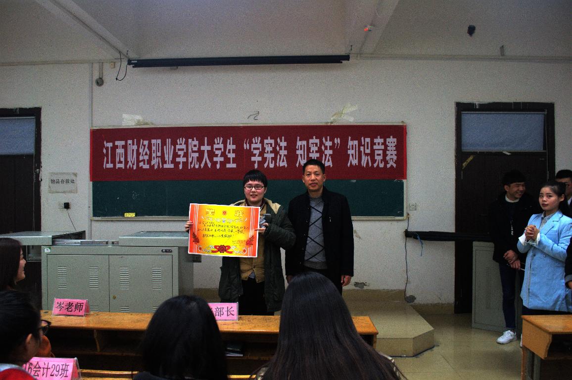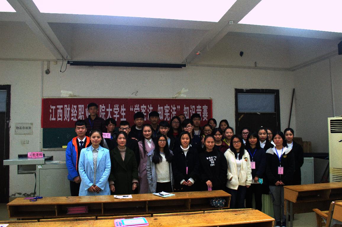 11月14日至12月2日,宣传统战处在全校组织开展“学宪法、知宪法”知识竞赛活动,各班级学生积极参加,认真学习、掌握宪法和相关法律知识,参与竞赛答题,掀起了学宪法、知宪法的热潮。12月2日晚,“江西财经职业学院大学生‘学宪法,知宪法’知识竞赛”决赛在综合楼阶梯教室2举行。选手们针对社会热点事件和身边的典型案例,运用宪法和法律知识进行分析评议,或慷慨激昂、或侃侃而谈,展示了对宪法和相关法律知识的较强认知与理解,他们的精彩表现赢得了观众的阵阵掌声。经过激烈的现场竞答,16级会计3班获得竞赛第一名,16级本科2班、16会计29班等5个班级分获二、三等奖。