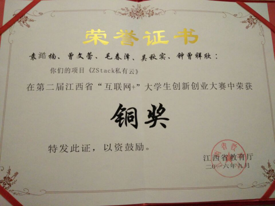 2016年9月,由江西省教育厅、江西省发展和改革委员会等部门总承办,江西省高等院校毕业生就业工作办公室承办,江西师范大学等单位协办的第二届江西省“互联网+”大学生创新创业大赛暨全国选拔赛在江西师范大学拉开帷幕。我校本科部派出由袁澔楠、钟曾祥欣、凌琪、曾文蕾、宋雨柔、黄宁清、毛春泽、吴秋实八位同学组成的“ZStack私有云”参赛队,代表江西财经大学在大赛中勇于拼搏,大展风采,荣获大赛铜奖。