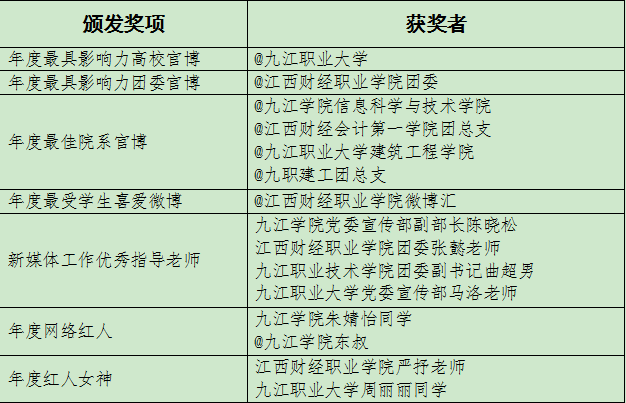 晚会对微博年度大数据、九江高校微博发展趋势进行解析,通过线上投票选举产生了九江高校各奖项获得者,以视频形式展现了校园中涌现出的热点事件,对校园微博红人和先进集体进行了表彰,以下个人和集体获奖: