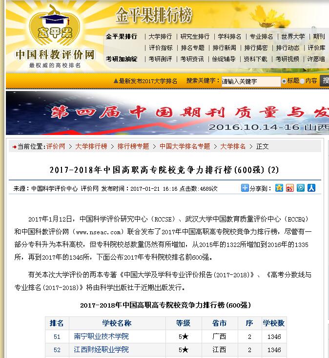 近日,中国科学评价研究中心、武汉大学中国教育质量评价中心和中国科教评价网联合发布了“2017年中国高职高专院校竞争力排行榜”,我校综合竞争力维持最高等级五星级评价,位居全国第52名,江西省第2名。