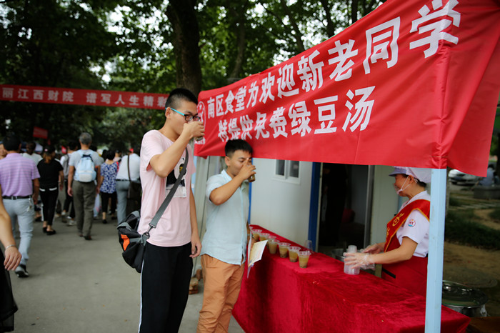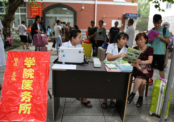 此次迎新,后勤管理处在新生报到点,设置了医疗服务站,对新生报到中可能出现的中暑等情况,进行及时的医疗护理;同时南北区食堂设置了绿豆汤发放处,免费提供绿豆汤,得到了新生及家长的一致称赞。
