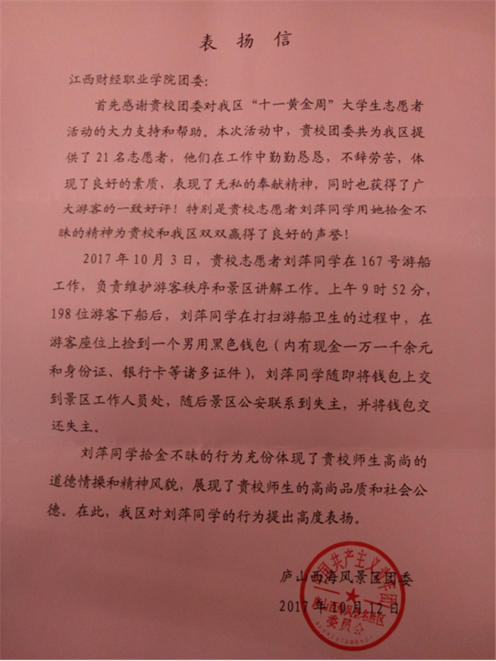 应庐山西海团工委邀请,国庆黄金周,团委派21名志愿者赴庐山西海风景区开展志愿服务。10月3日,经济贸易学院志愿者刘萍在清扫景区游船的过程中,拾到一个黑色钱包,内有现金11000元、身份证及银行卡等多个证件,刘萍随即将钱包上交景区工作人员,景区公安随后联系失主,将钱包归还。