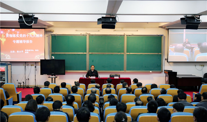 林火平校长从深刻领会党的十九大精神的丰富内涵,党员干部带头当好学习贯彻表率,迅速掀起学习宣传贯彻党的十九大精神热潮三个方面对十九大会议精神进行了深入解读和生动阐述。