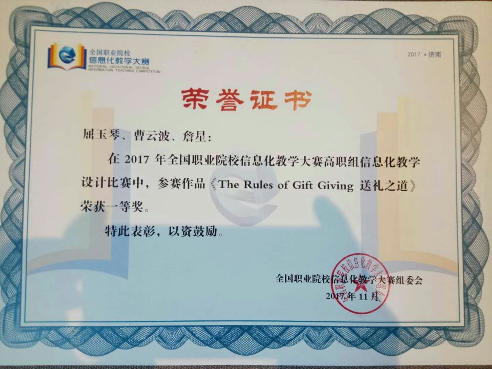 本次大赛,有来自全国的参赛作品1587件,参赛教师4114人。经大赛组委会专家评审后,共有372件参赛作品入围现场决赛,其中高职组信息化教学设计作品102件、信息化课堂教学作品44件、信息化实训作品27件。经过激烈角逐,我校屈玉琴、曹云波、詹星的参赛作品《The Rules of Gift Giving 送礼之道》最终获得全国信息化大赛高职组信息化教学设计比赛赛项一等奖。