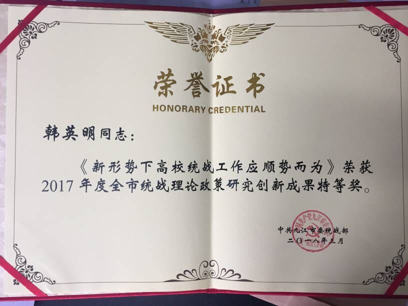 3月2日,中共九江市委统战部发文《关于2017年全市统战工作综合先进单位、工作进步奖、理论政策研究创新成果奖、统战工作实践创新成果奖获奖单位的通报》(九统字[2018]12号),我校选送的论文《新形势下高校统战工作应顺势而为》(作者:韩英明)荣获全市统战理论政策研究创新成果特等奖。日前召开的2018年全市统战工作会议对获奖的优秀单位和个人进行了表彰。
