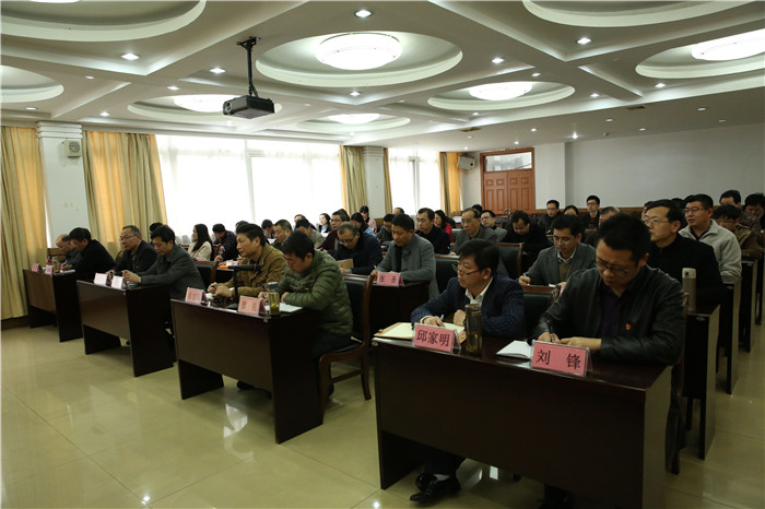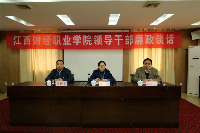 2018年3月16日下午,省财政厅党组成员、省农发办主任何桑来我校与学校领导干部开展集体廉政谈话。廉政谈话在培训中心二楼会议室进行,谈话由驻厅纪检组副组长简根平主持,谈话对象为校领导班子成员及各部门各二级学院主要负责人。