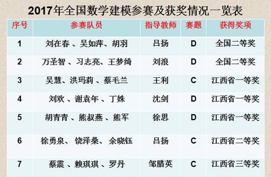 2017年“高教社杯”全国大学生数学建模竞赛成绩于近日公布,我校数学建模参赛队获得全国二等奖2项,江西省一等奖3项,江西省二等奖1项,江西省三等奖1项,夺得江西省数学建模(专科组)团体总分第二名。