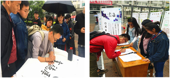 仪式以传统汉服表演拉开帷幕,同步开展横幅签名、书法展示、你荐书我买单、学习通APP下载等活动。现场体验了“古有书中黄金屋,今有掌中摇一摇”微信摇一摇互动,通过微信平台向全校师生推荐书籍、分享读后感等?;疃殖?,同学们积极互动,并表达了对此次读书文化节美好的期望。