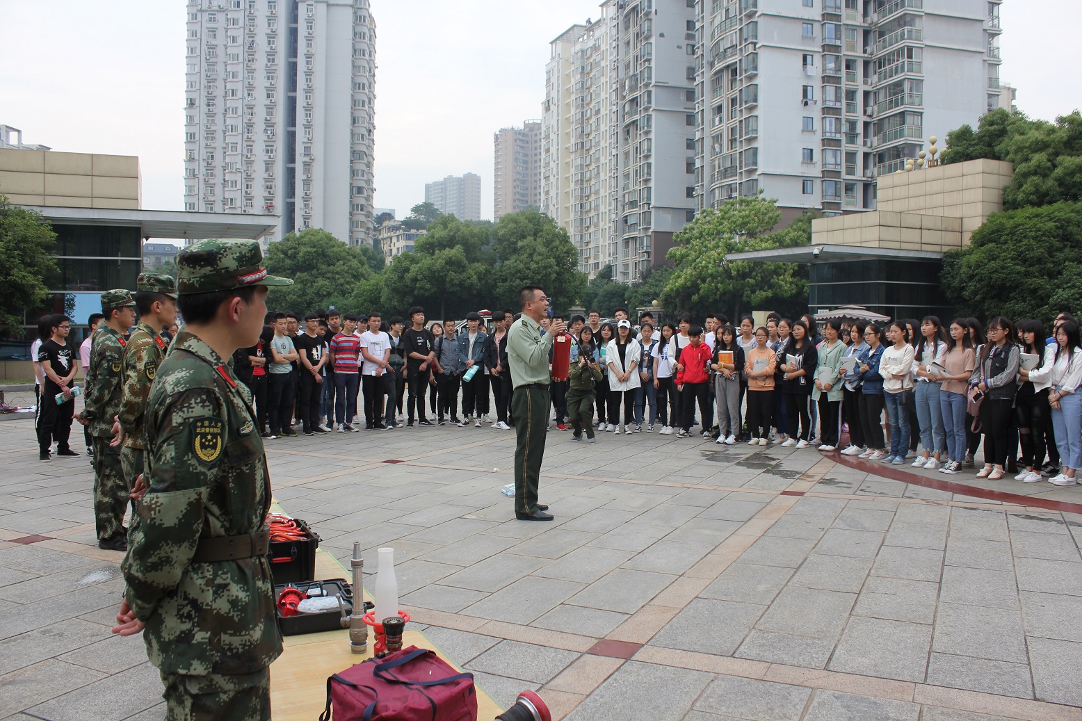 5月12日是我国第十个防灾减灾日,为普及全民防灾减灾知识,增强学校师生的消防安全意识,提高应急疏散能力, 5月10日下午,安全保卫处联合九江市浔阳区消防大队在学校东门广场举行消防安全演练活动,200余名师生参加演练。