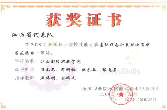 经过一天的激烈角逐,由邹通荣、陈科榕、万冬冬、樊良超四名队员组成的江西财经职业学院代表队最终在这一全国高职院校最高规格和最高水平的比赛中脱颖而出,再次荣获一等奖的好成绩,实现了我校在此项赛事中连续四年荣获“一等奖”,指导教师席伟明、余晖文获全国优秀指导教师奖。成绩的取得是对我校坚持走“五有”内涵跨越式发展道路,大力培养“四具备”高端技术技能人才实际成效的一次成果检验。