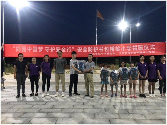 为弘扬人道,博爱,奉献的红十字精神,提高少年儿童自救互救能力,促进少年儿童安全健康成长,日前,受江西省红十字基金会委托,我校红十字会在都昌县桥岭村小学举办“同圆中国梦、守护安全行”中小学生安全防护书包捐赠仪式,向该村留守儿童捐赠价值14500元的50套安全书包。