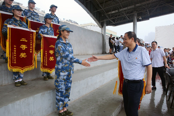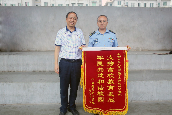 阅兵式后,林火平代表学校向中国人民解放军空军某部赠送了锦旗,感谢部队对我校军训工作的大力支持。校领导和部队首长还为军训优胜队伍颁发了锦旗。