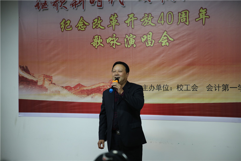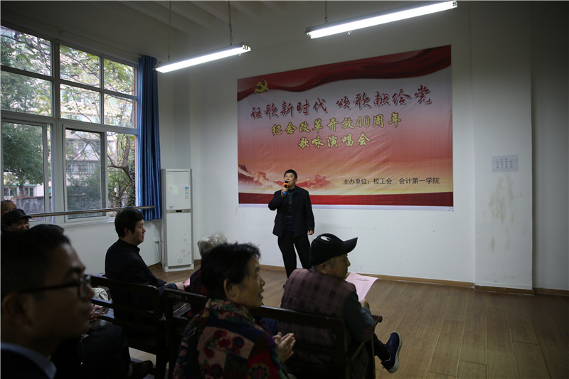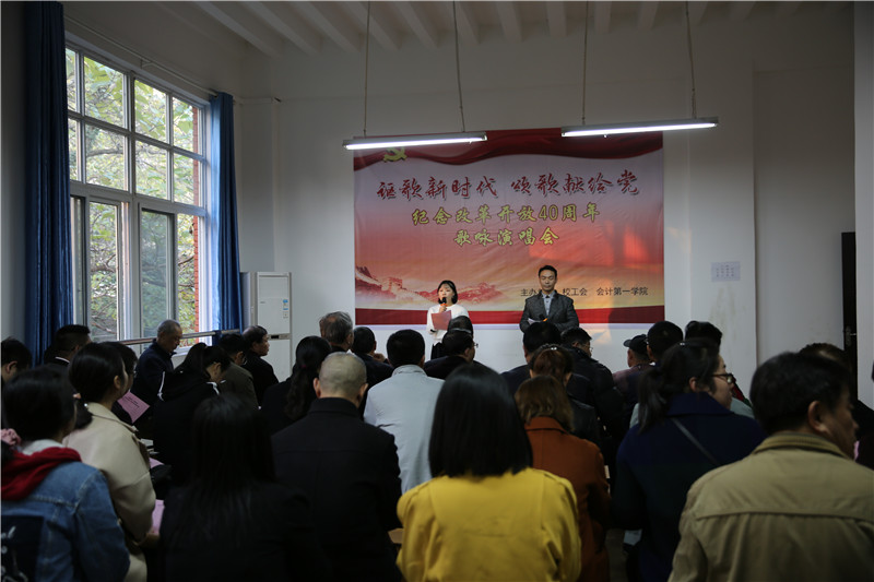 在我们伟大祖国迎来改革开放四十周年之际,为回顾我国改革开放取得的伟大成就,歌颂我们党领导中国人民进行改革开放和现代化建设取得的光辉业绩,11月27日下午4:30,校工会与会计第一学院在本校东校区红楼工会职工俱乐部联合举办了以“讴歌新时代颂歌献给党”为主题的纪念改革开放40周年歌咏演唱会。校工会、会计第一学院的教职工代表及我校离退休老同志代表共六十余人参加了此次活动,由卢路和吕相宜两位青年教师担任本次演唱会的主持人,离退休党总支和会计第一学院党总支共同选送了十一个节目登台演出,参加演唱的丁良珠、陈卫东、廖剑、黄益军、杨郁、卢洪信、张家顺、杨燕、卢路、吕相宜、徐佳佳等十一位党员教师用动人的歌声、饱满的激情、优美的旋律、优秀的歌曲、良好的形象,放歌新时代,唱响主旋律,向祖国改革开放四十周年献上最美好的祝愿。