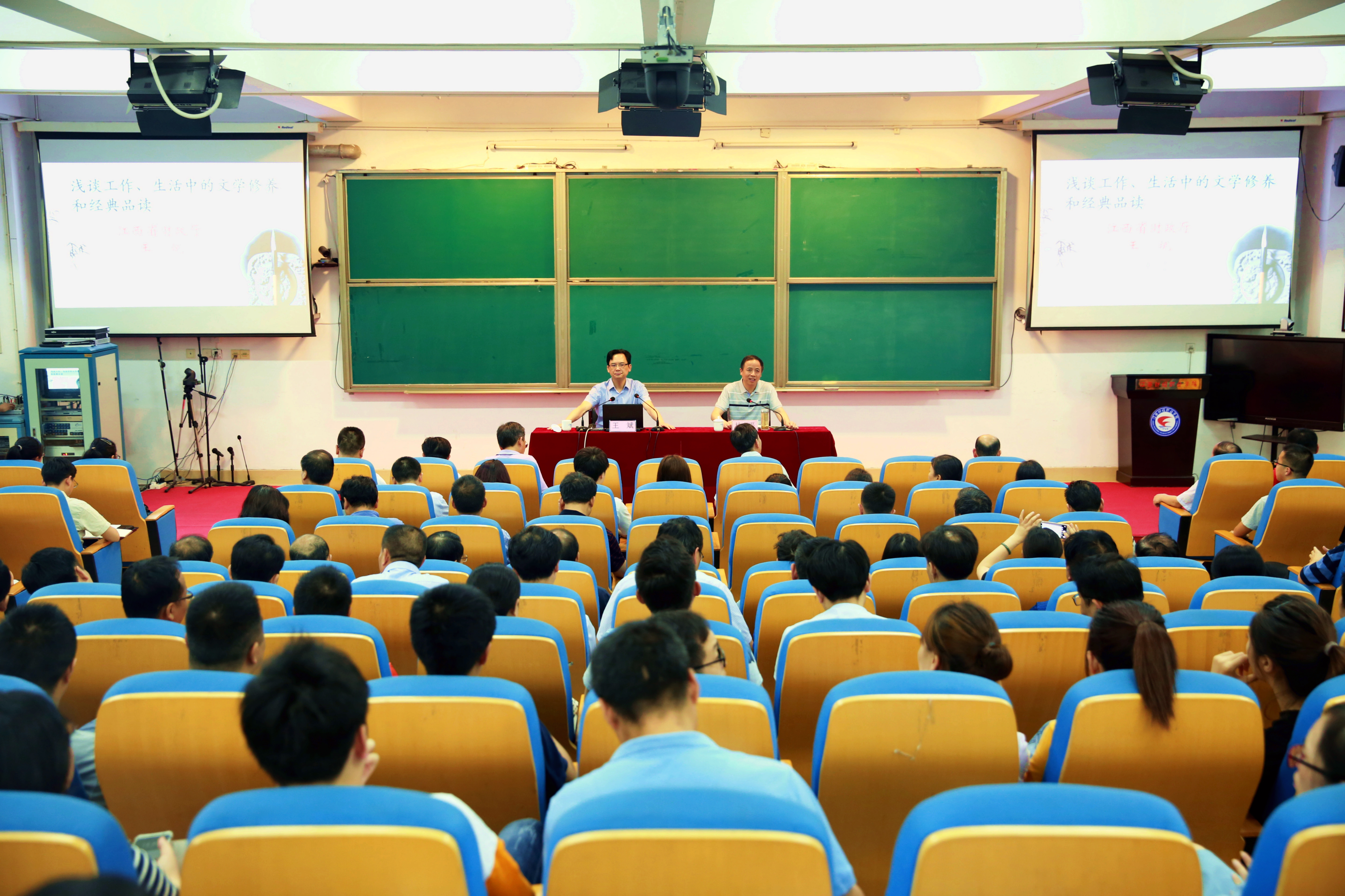 讲座以毛泽东主席《星星之火,可以燎原》光辉著作开篇,以文化为主线,通过对中国文学史发展主线进行评释,讲述了我国博大精深、源远流长的文学历史,品读了从先秦诗经、楚辞到唐宋诗词等不同历史时期的经典名作,并结合自身经历,从为何要提高自身的文学修养、如何才能提高文学修养、文学修养与欣赏的提高对个人的工作生活存在什么样的影响等几个方面娓娓道来,既深入浅出,又风趣幽默。同时,王斌还与师生重温那些曾经学过的古诗词,分享诗词之美,感受诗词之趣,台上台下互动响应,一唱一和,气氛热烈,掌声不断。